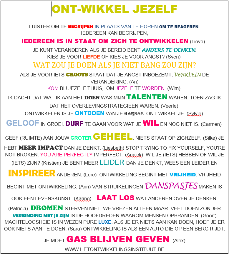 PS: Het ontwikkelingsmanifest bestaat uit citaten uit de eindgetuigenissen van de studenten “Professionele ontwikkelingsgerichte Coaching” bij het Ontwikkelingsinstituut.